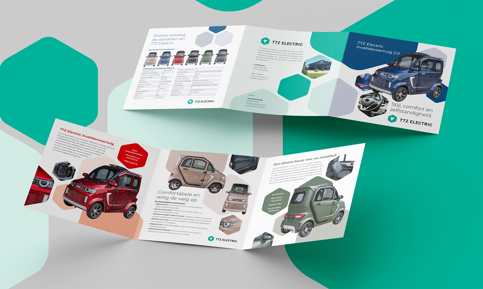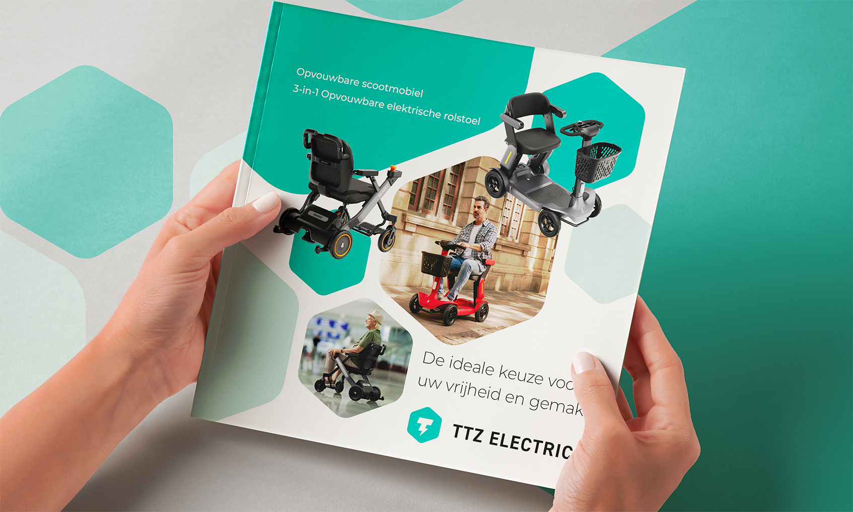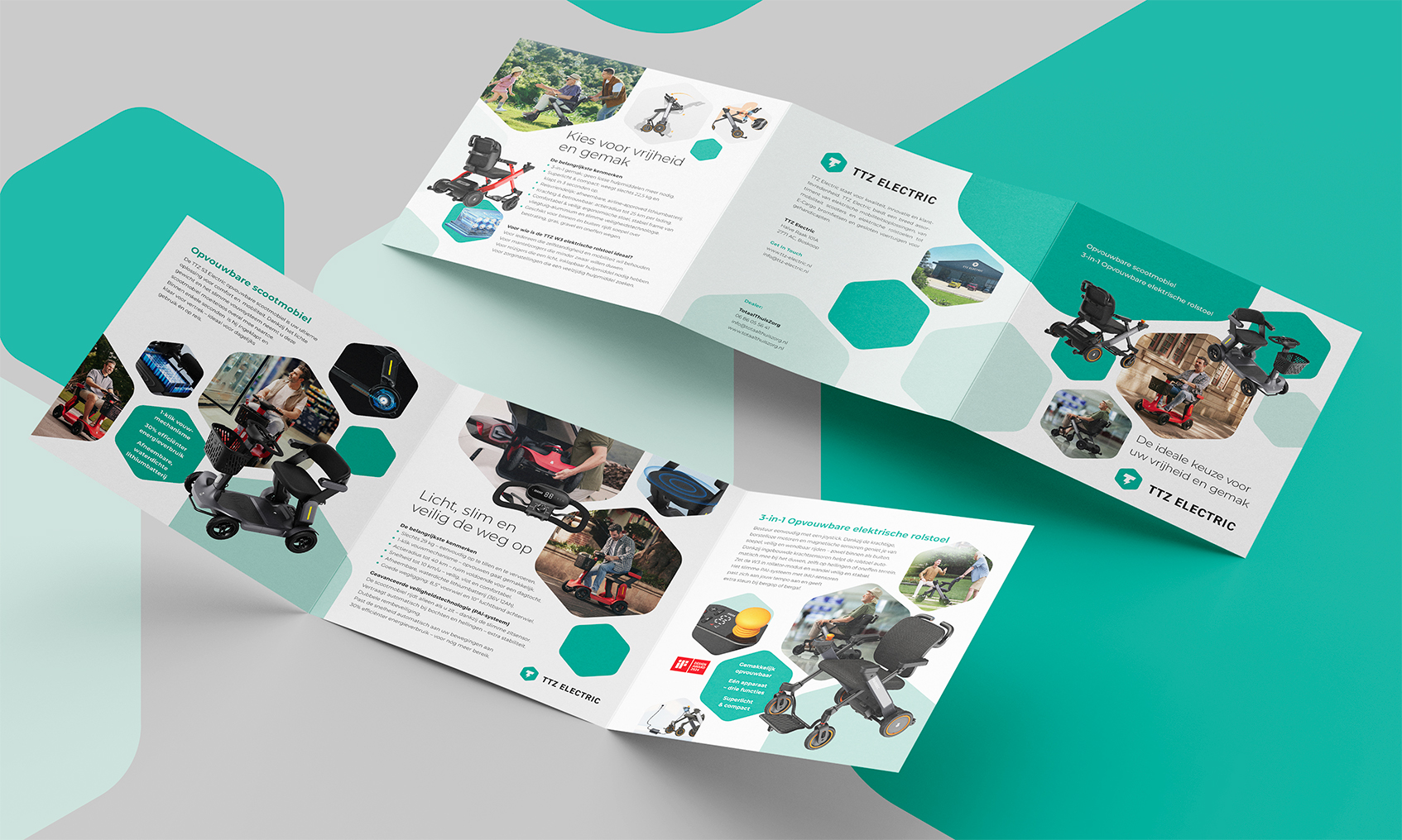 Ontwerp van een complete brochurelijn voor de mobiliteitsproducten van TTZ Electric. Een heldere en stijlvolle presentatie van hun aanbod, variërend van opvouwbare elektrische rolstoelen en scootmobielen tot de unieke SKY Scootmobiel en invalidevoertuigen.