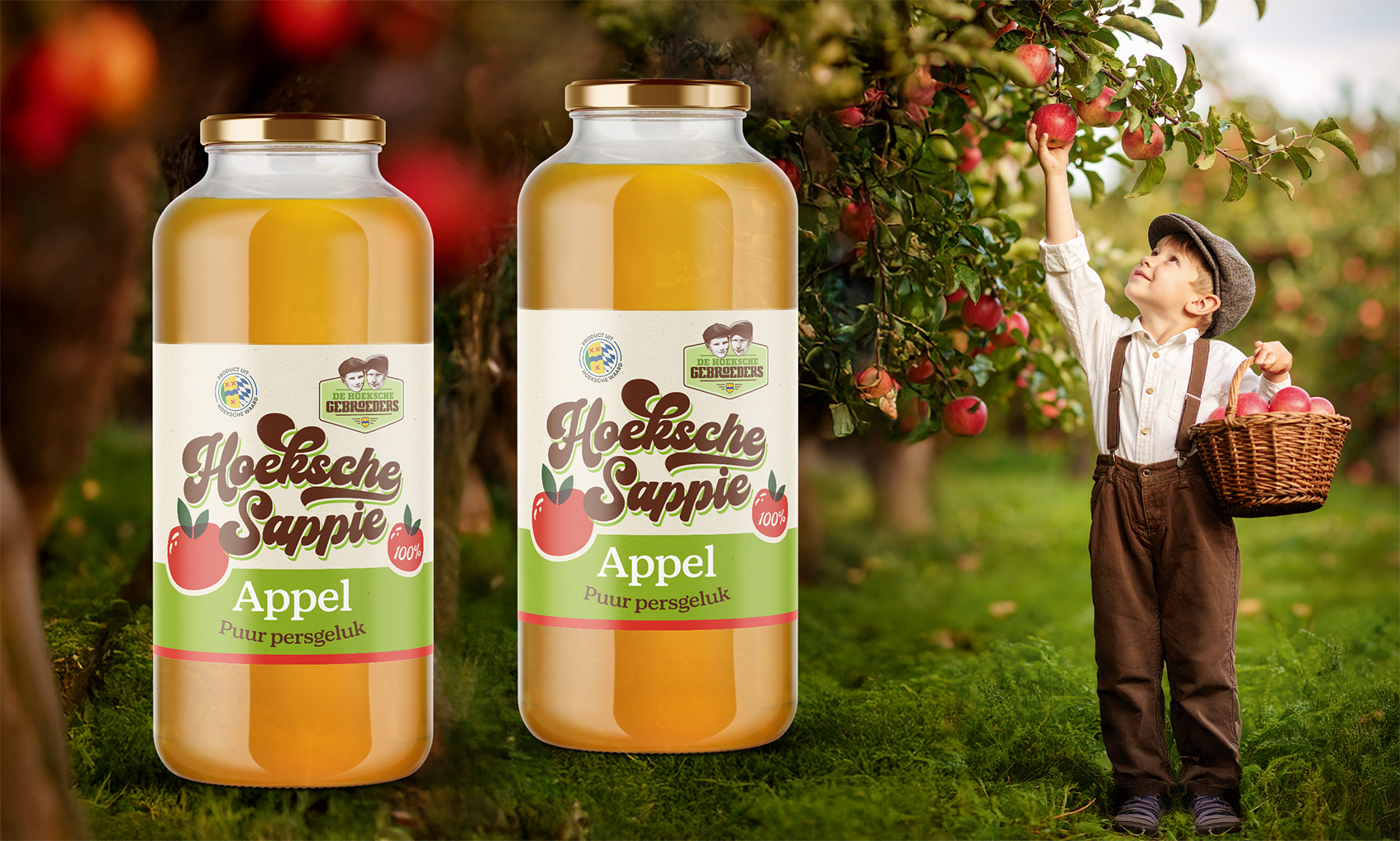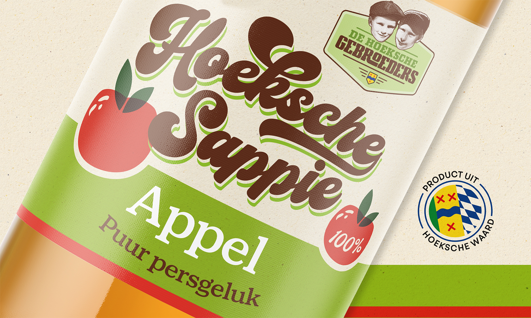 Nieuwe etiket voor de Hoeksche Sappie ‘Appelsap’ voor De Hoeksche Gebroeders. Een product uit de Hoeksche Waard. De appel valt niet ver van de boom.